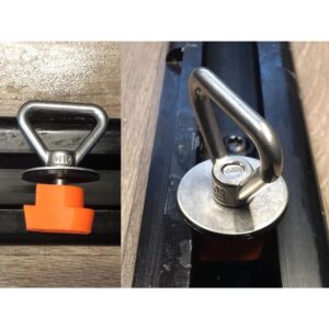 z. B. Zurröse mit Nutenstein befestigen: in Schienensystem stecken – Position finden – verschrauben – erledigt. Aufgrund der Verrundung auf einer Seite verkeilt sich der Nutenstein im Schienensystem optimal. Beim Öffnen dreht er sich um 90° selbständig und kann somit ohne Werkzeug befestigt und entnommen werden. Sie könnten auch eine größere Platte im Boden befestigen ohne den Nutenstein gegenhalten zu müssen….